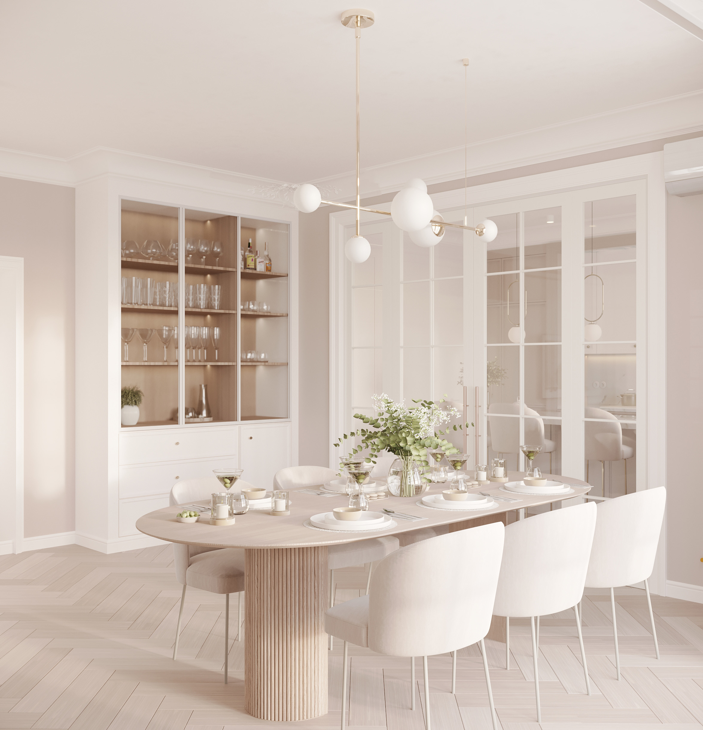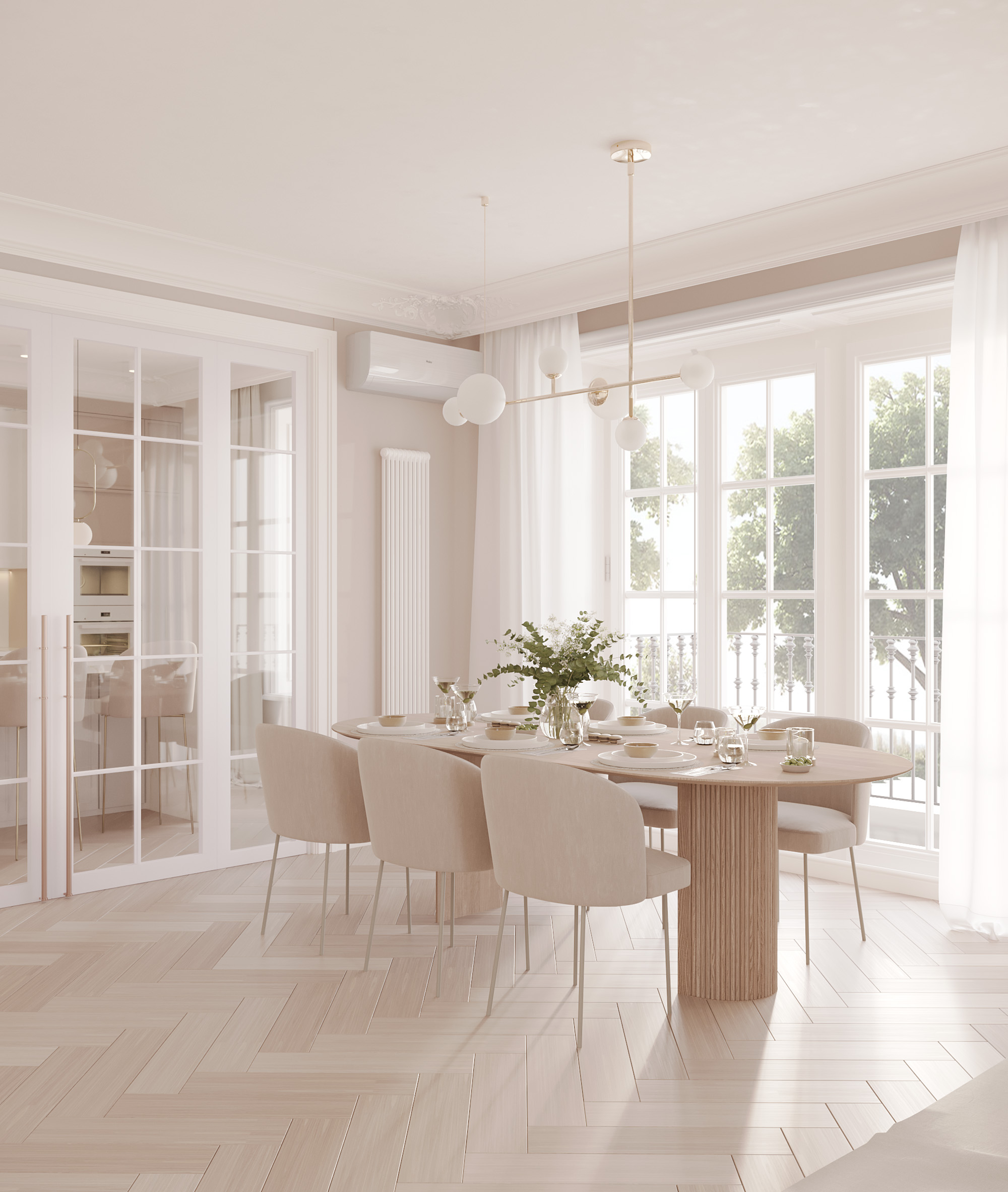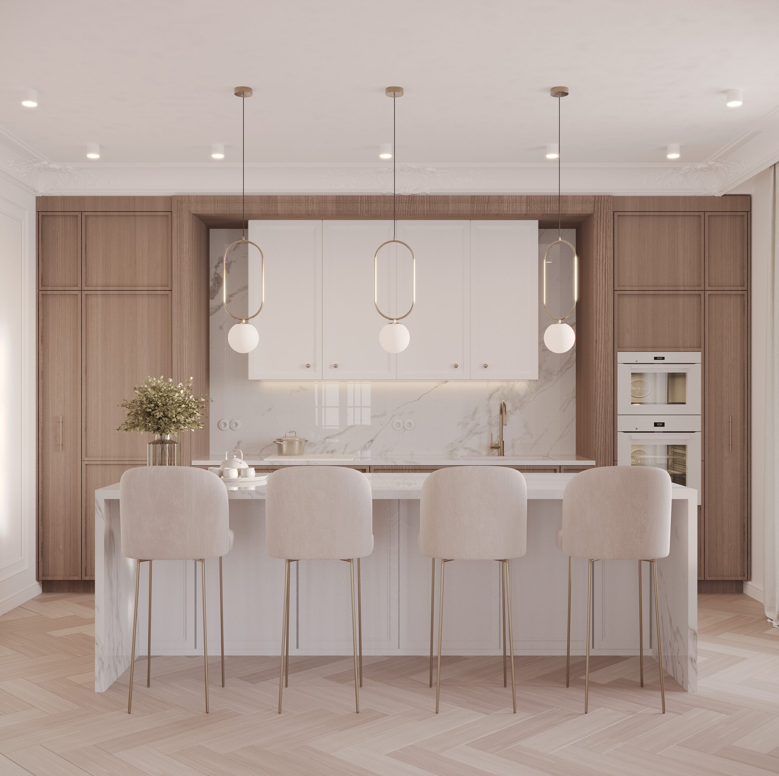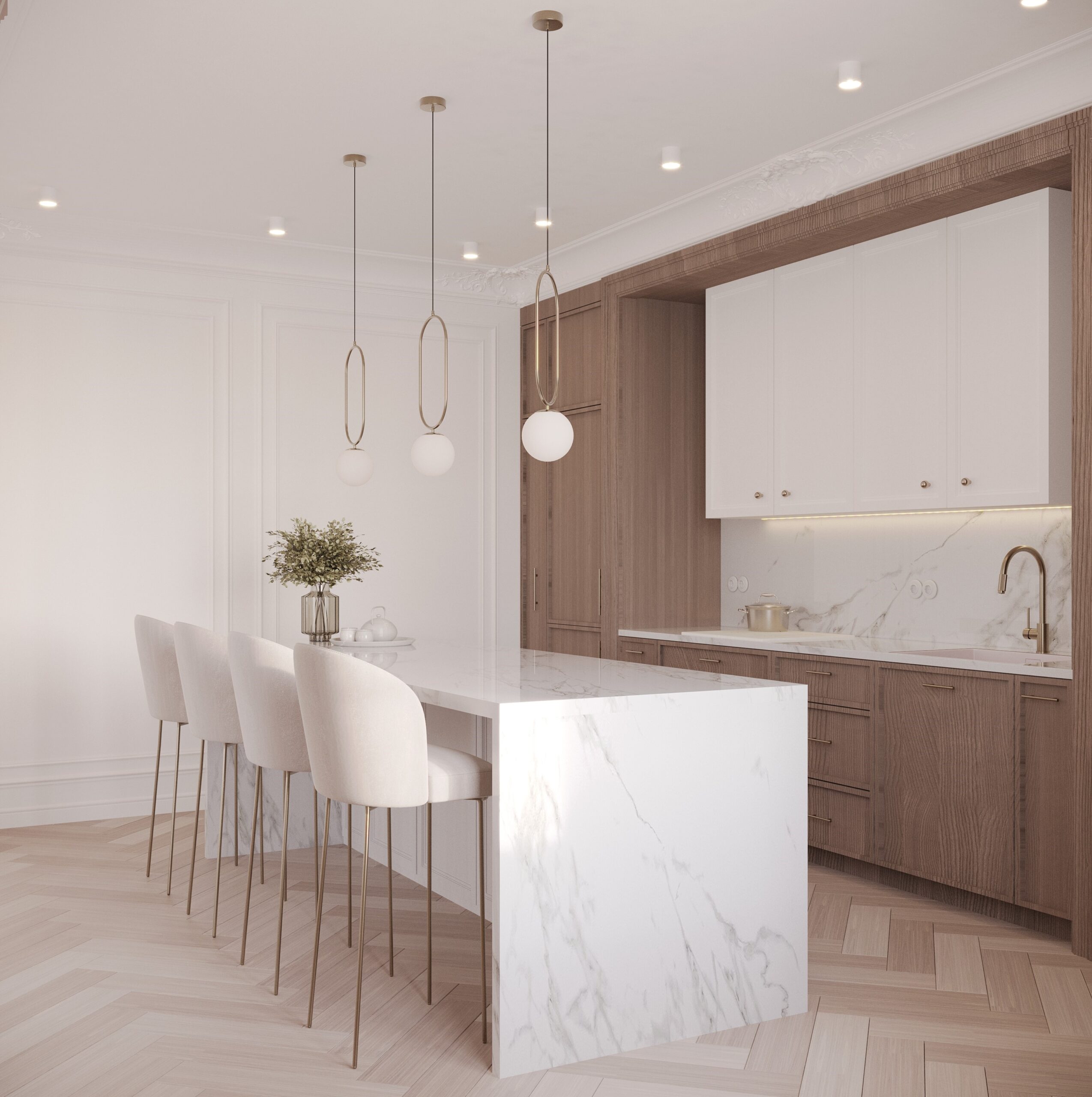 Centralnym punktem parteru jest przestronny salon połączony z jadalnią. W salonie znajduje się komfortowa, jasna sofa, idealna do wypoczynku, oraz minimalistyczny stolik kawowy wykonany z marmuru. Przestrzeń dopełnia dużyżyrandol, który stanowi elegancki akcent. Jadalnia, z dużym stołem z naturalnego drewna i białymi krzesłami, doskonale komponuje się z resztą wnętrza.