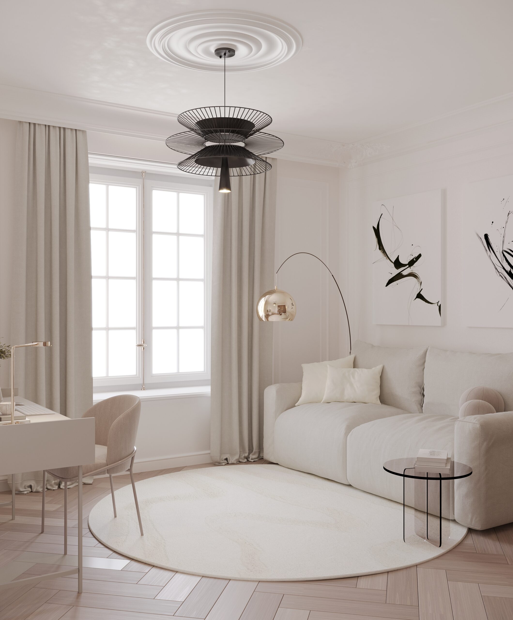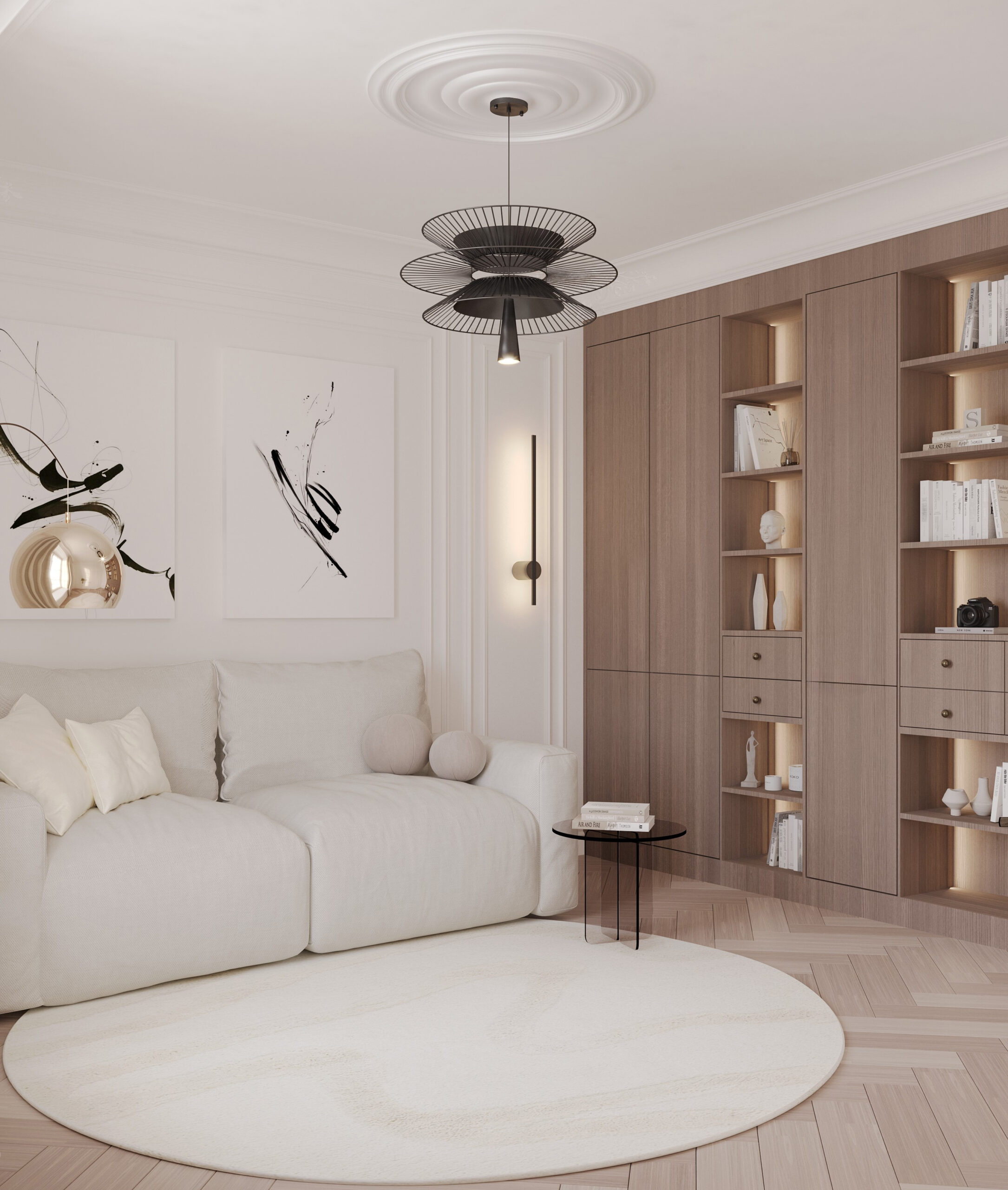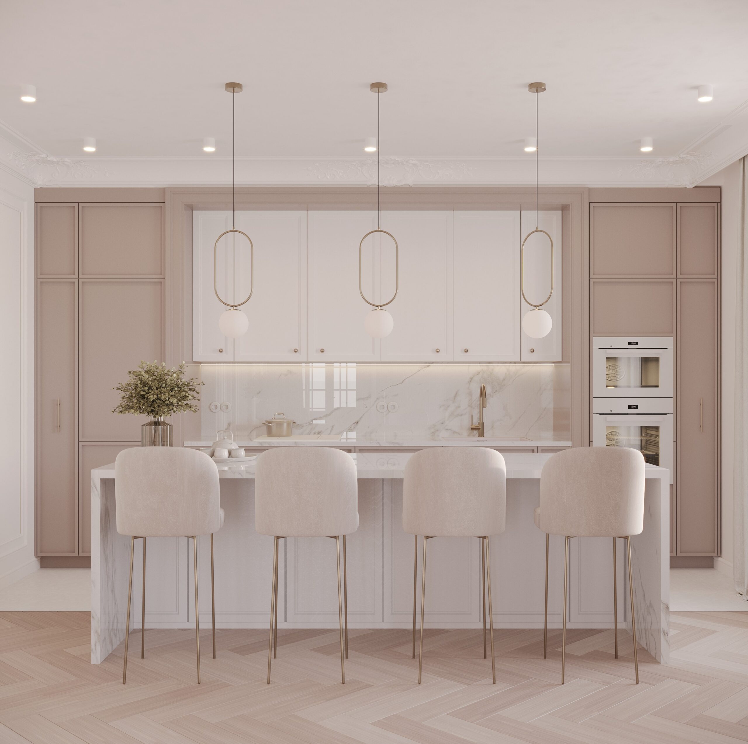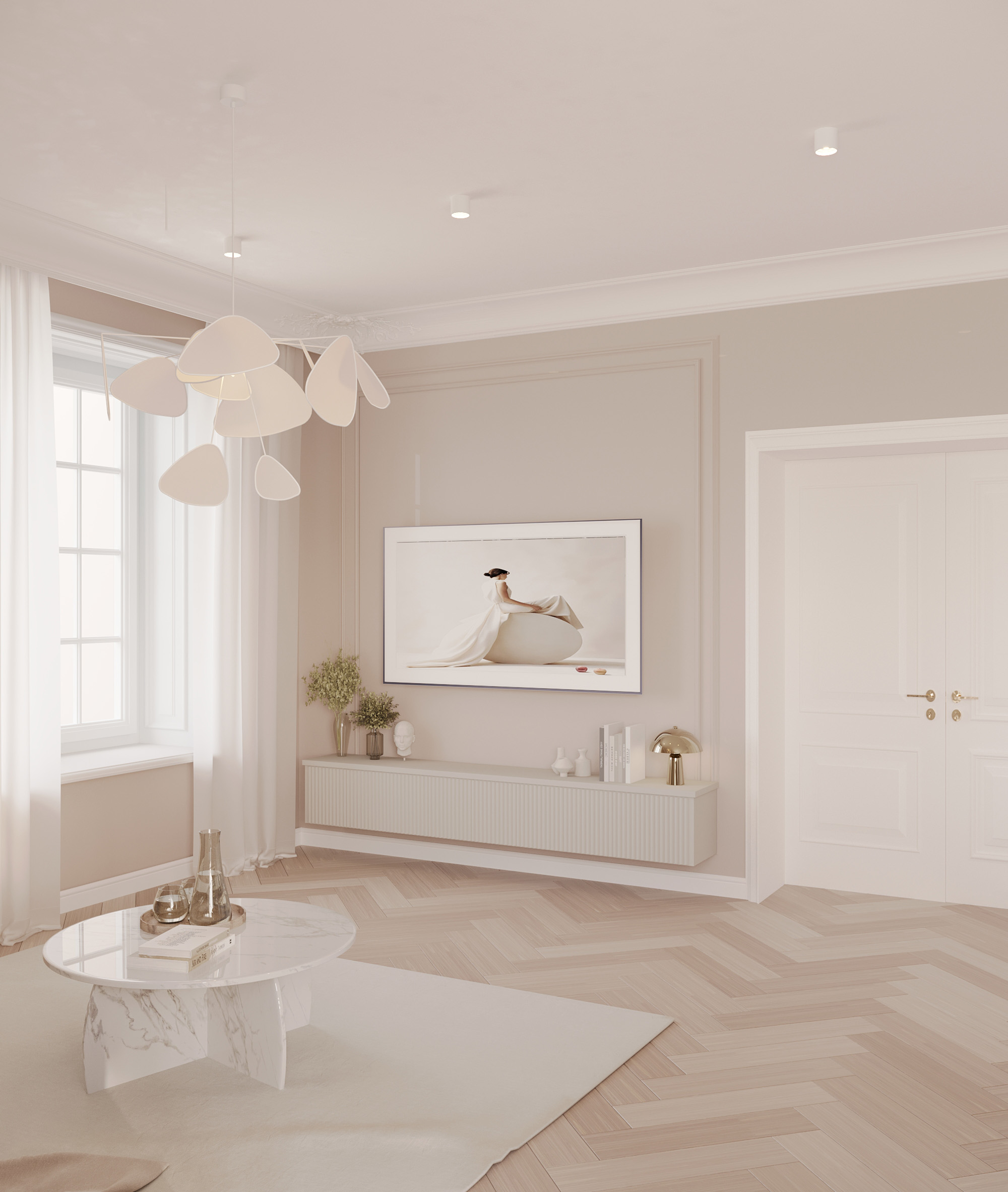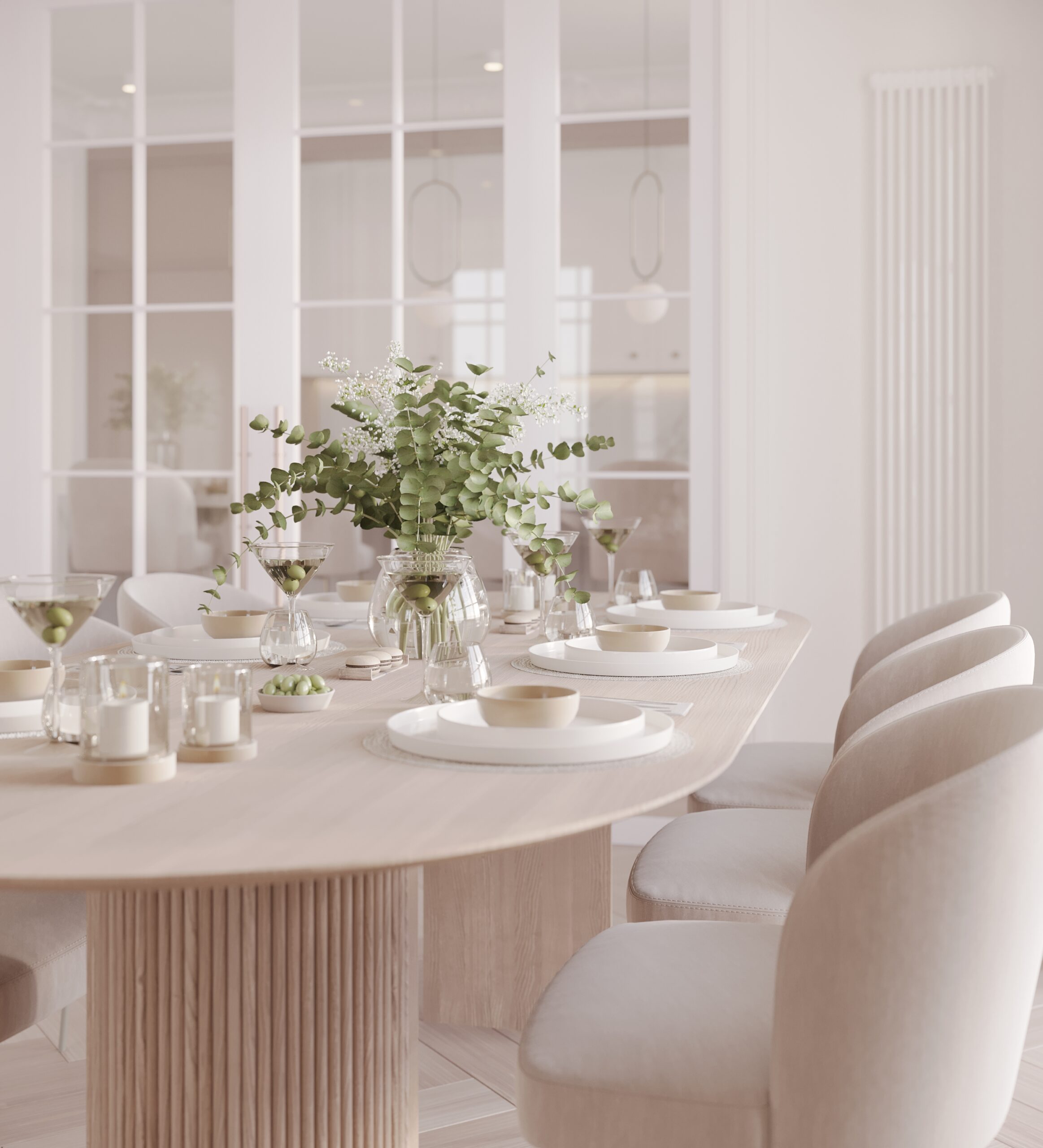 Centralnym punktem parteru jest przestronny salon połączony z jadalnią. W salonie znajduje się komfortowa, jasna sofa, idealna do wypoczynku, oraz minimalistyczny stolik kawowy wykonany z marmuru. Przestrzeń dopełnia dużyżyrandol, który stanowi elegancki akcent. Jadalnia, z dużym stołem z naturalnego drewna i białymi krzesłami, doskonale komponuje się z resztą wnętrza.