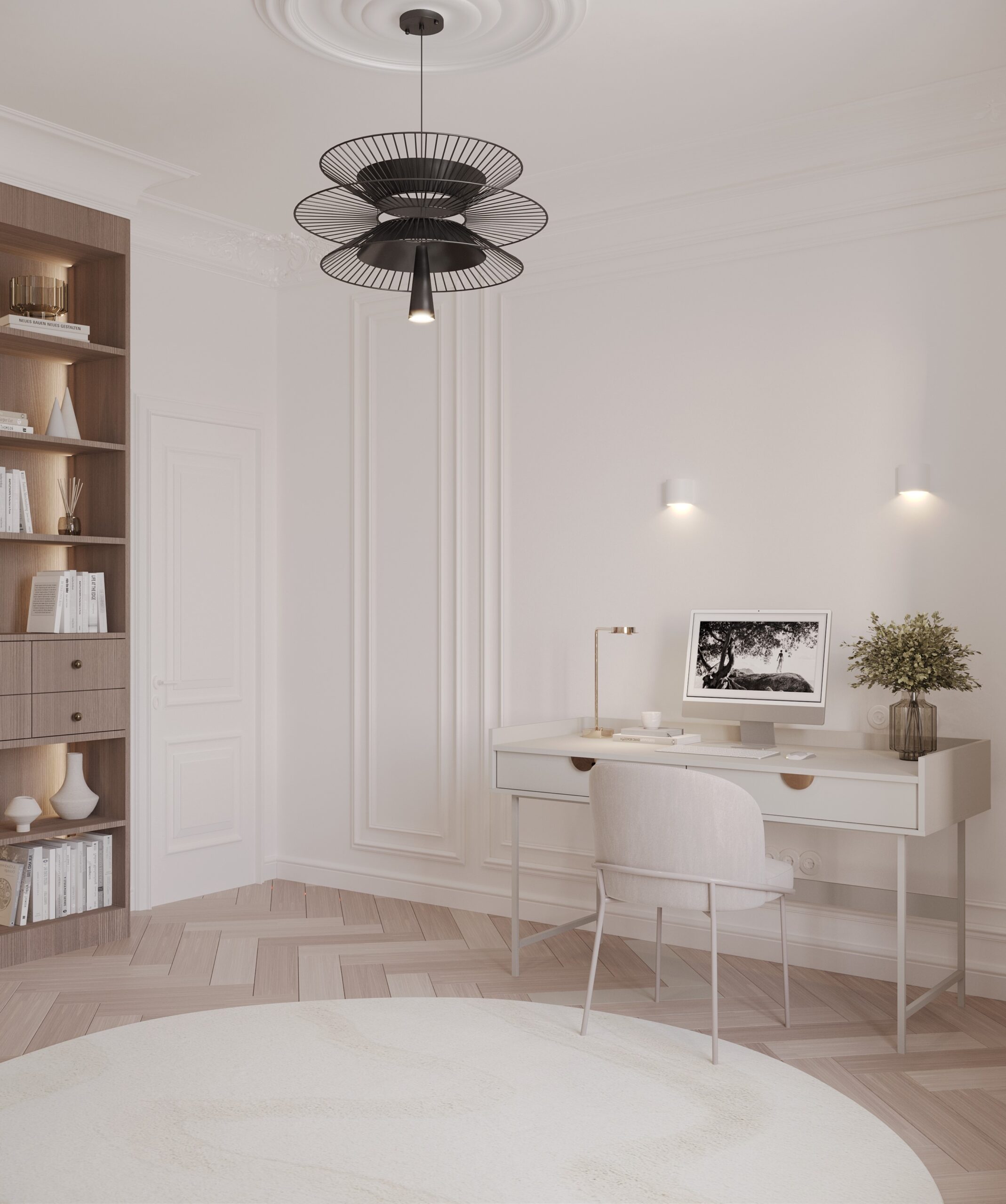 Dodatkowo, na parterze znajduje się również elegancki gabinet, który stanowi idealne miejsce do pracy zdalnej. Gabinet został urządzony w stonowanych kolorach, z biurkiem wykonanym z wysokiej jakości materiałów i wygodnym fotelem, zapewniającym komfort podczas długich godzin pracy.