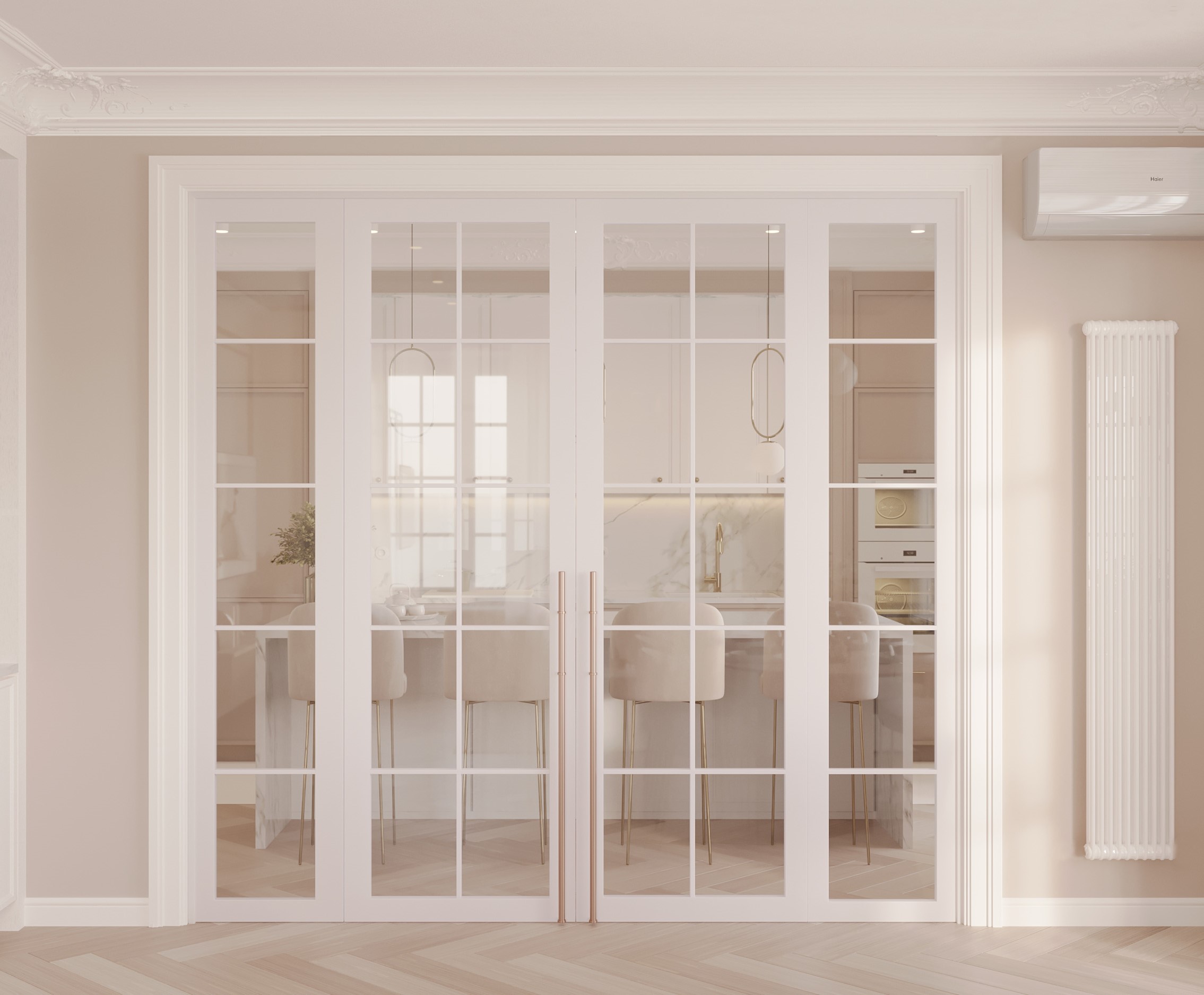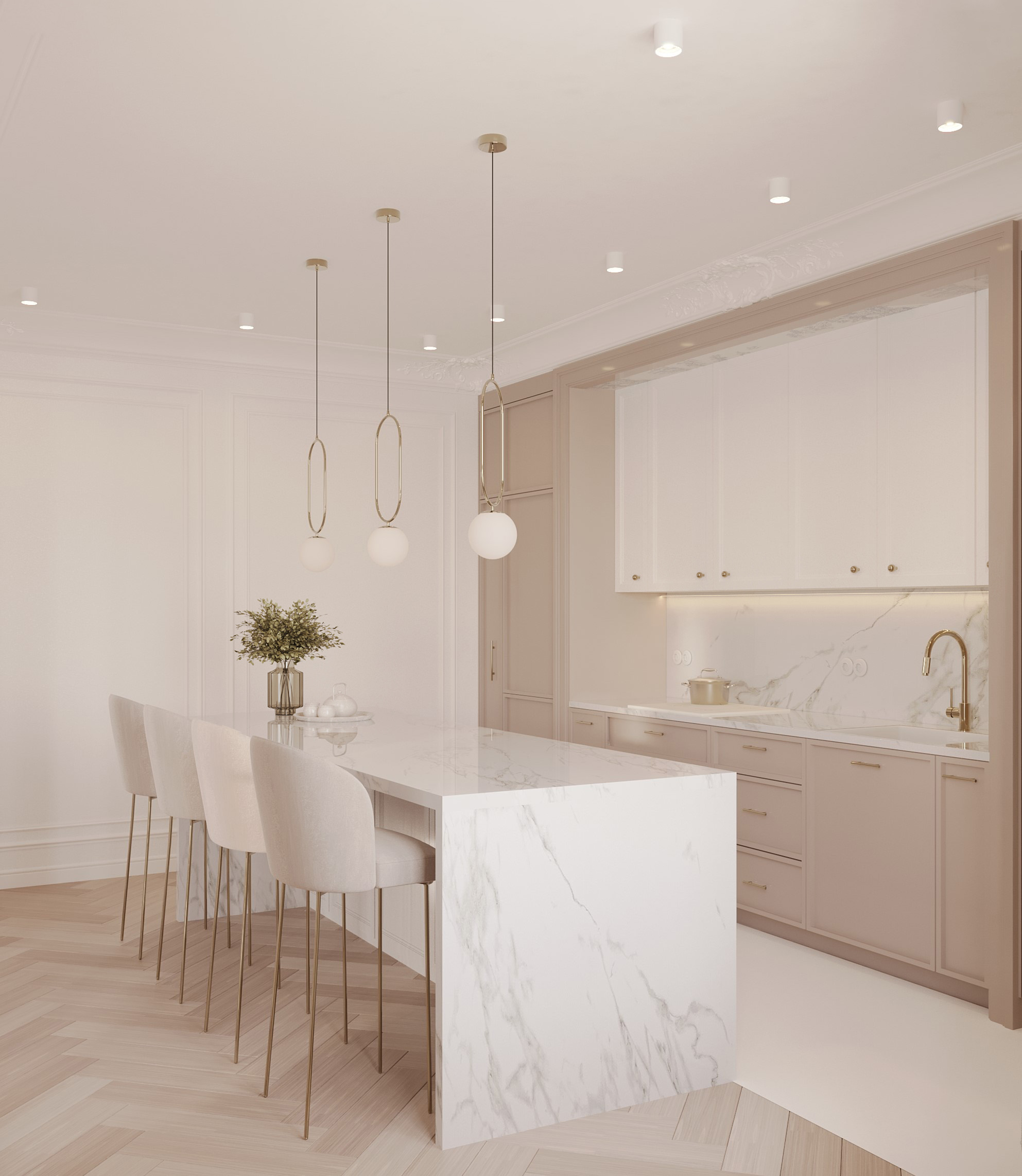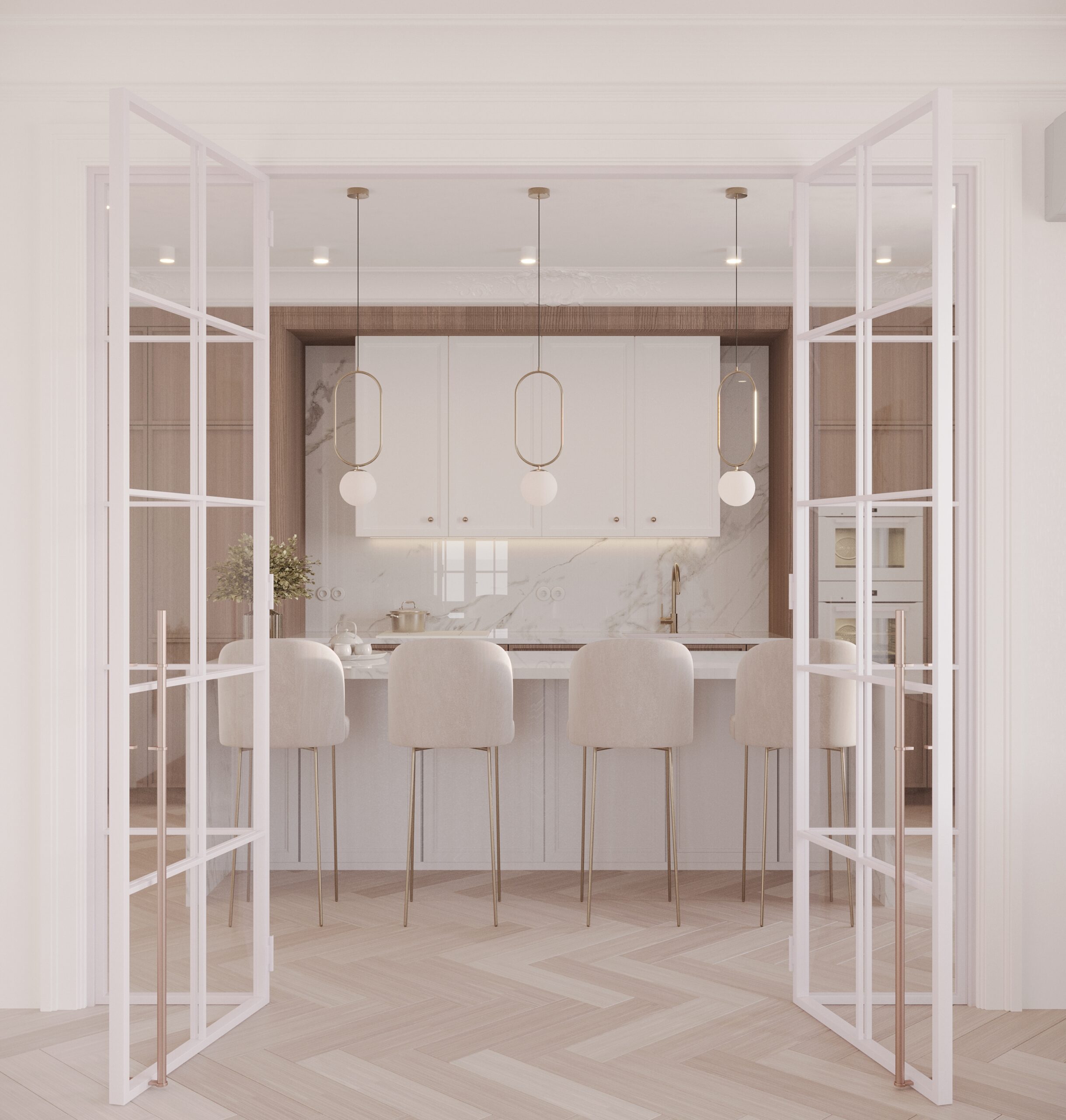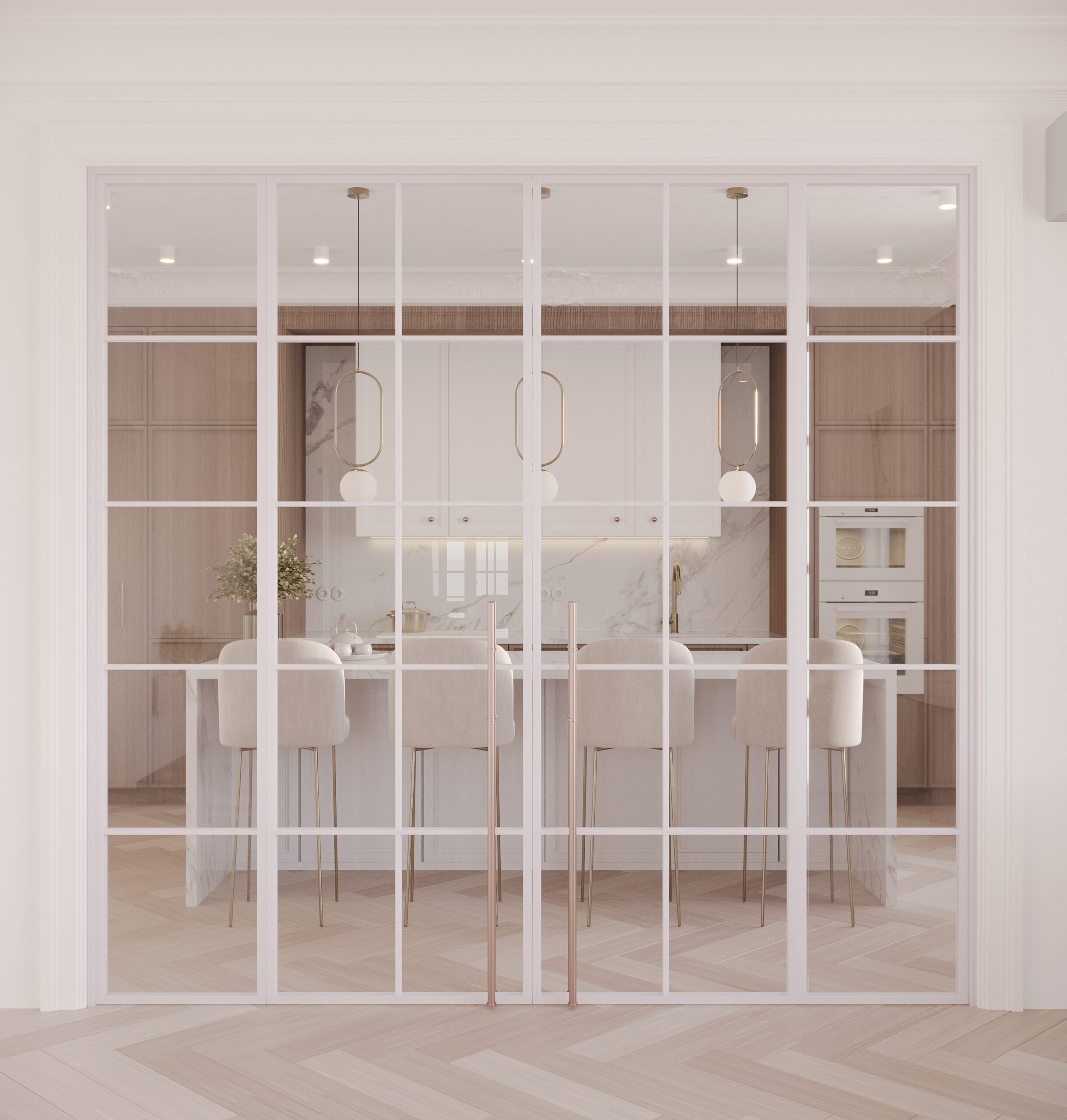 Obok salonu, za szklanymi drzwiami, znajduje się przestronna kuchnia z dużą wyspą. Przygotowaliśmy dla inwestorów dwie propozycje aranżacji kuchni: