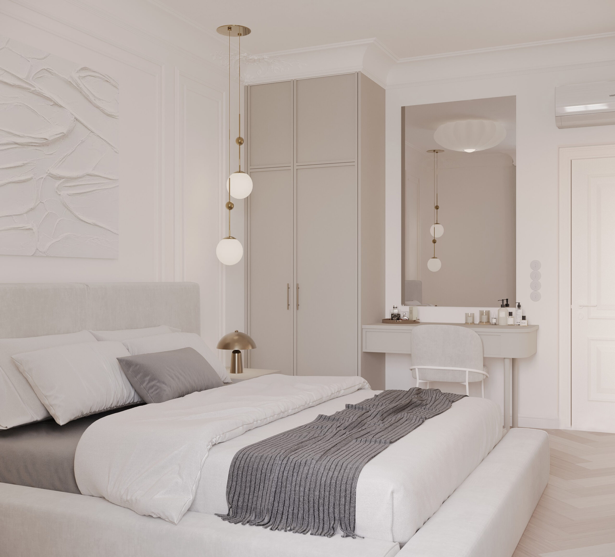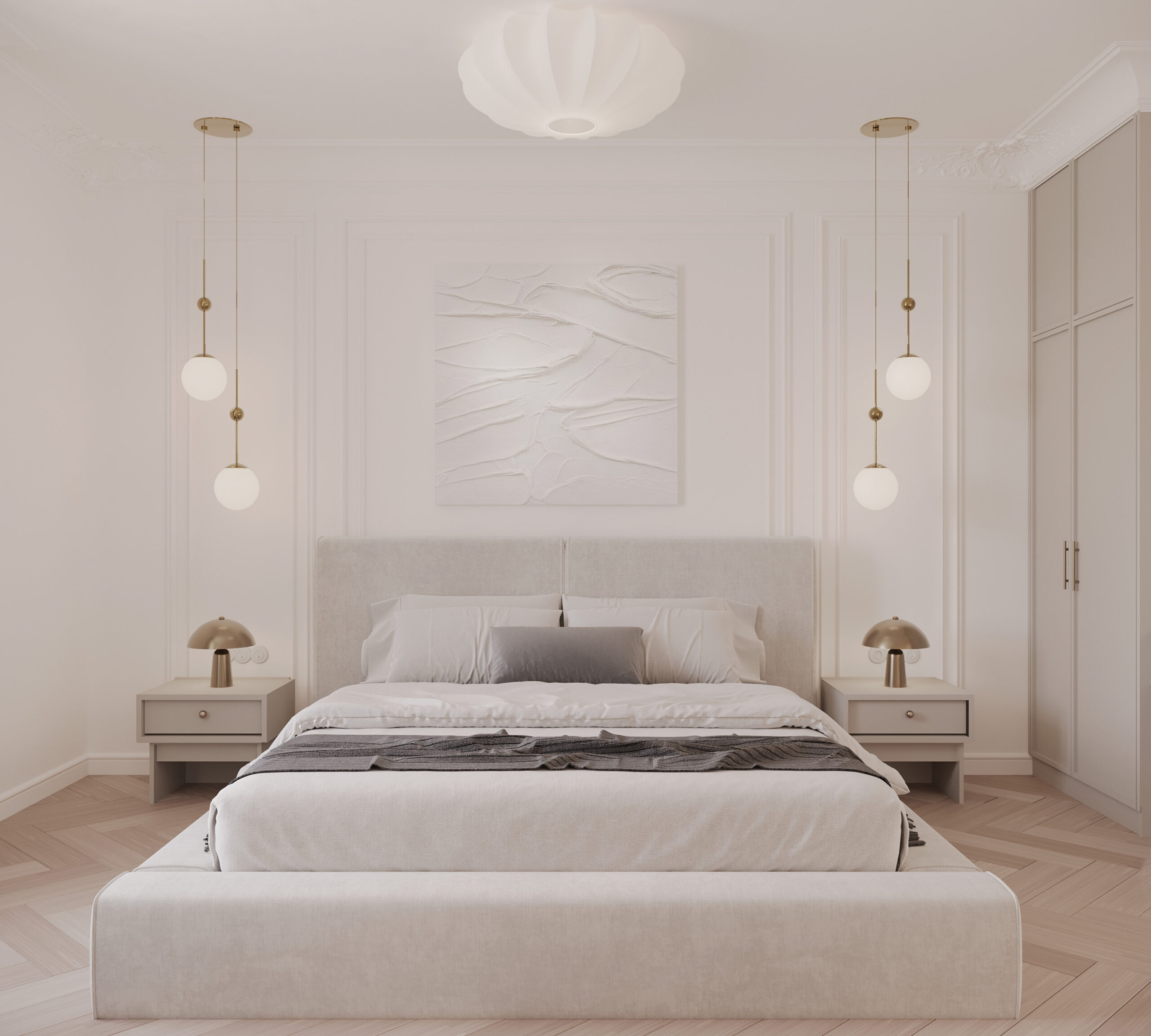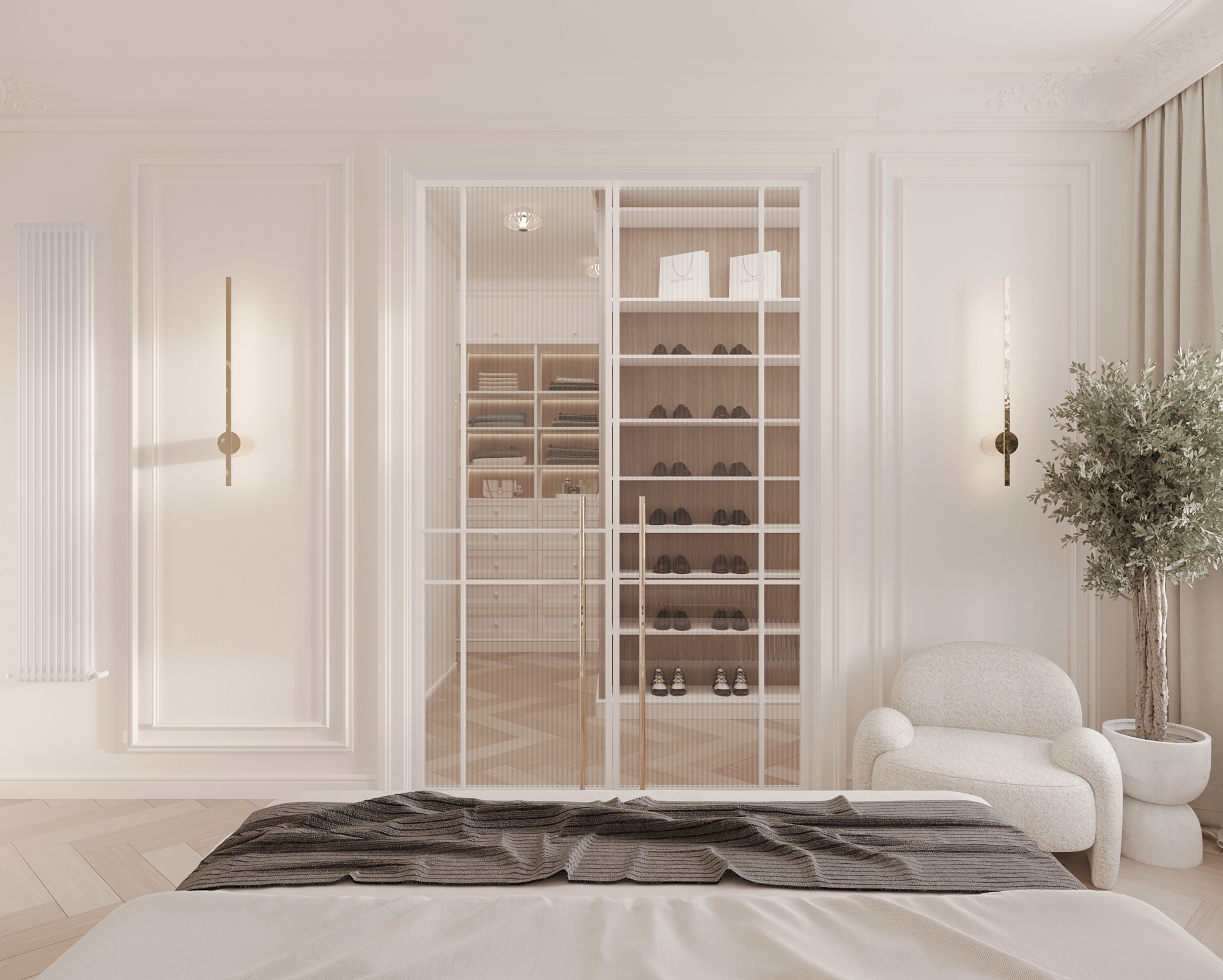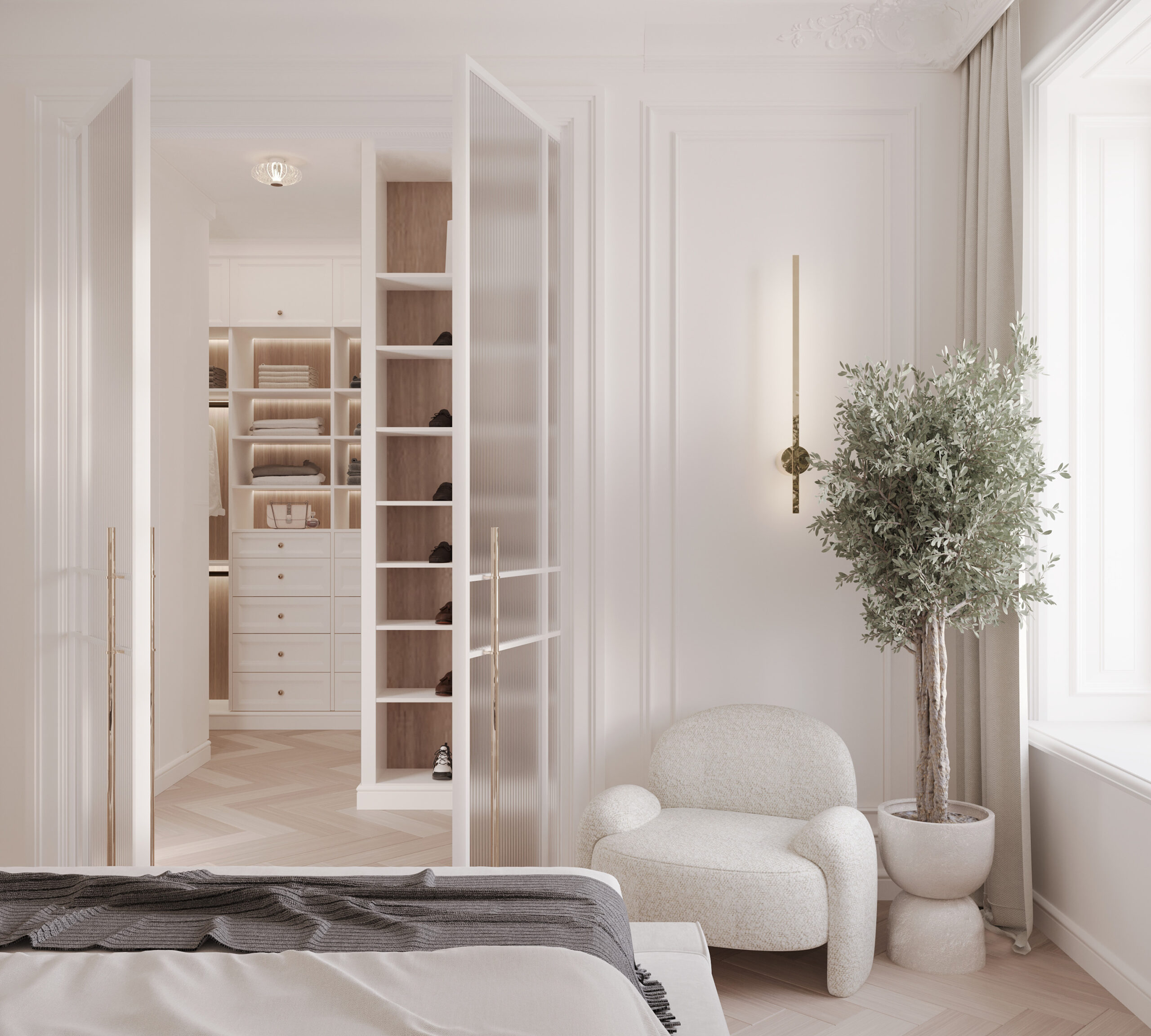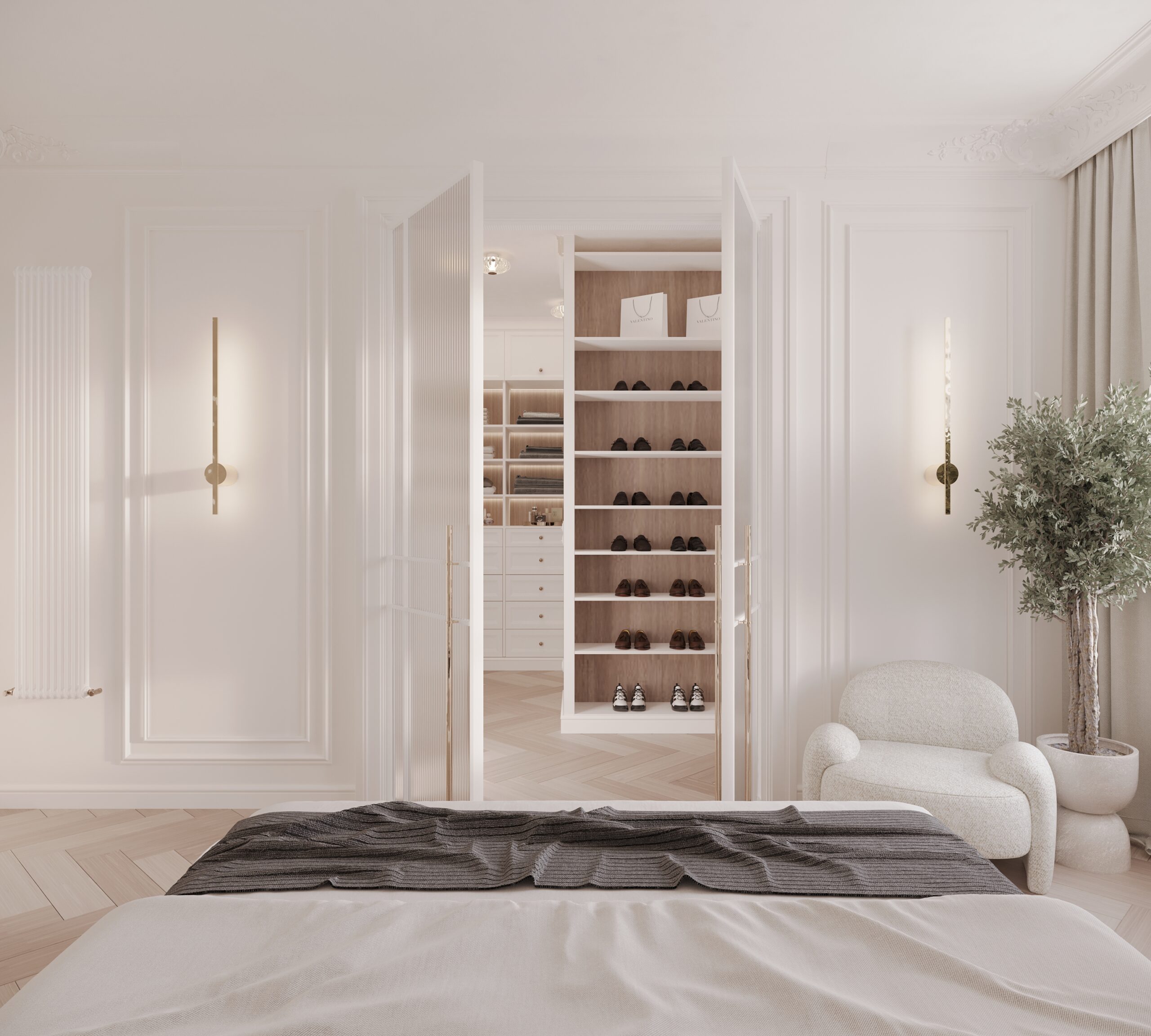 Po lewej stronie domu znajduje się master bedroom, który zaprojektowaliśmy z myślą o maksymalnym komforcie. Sypialnia posiada dwie garderoby: jedną na buty oraz drugą na ubrania, podzieloną na strefę damską i męską, zgodnie z potrzebami użytkowników.