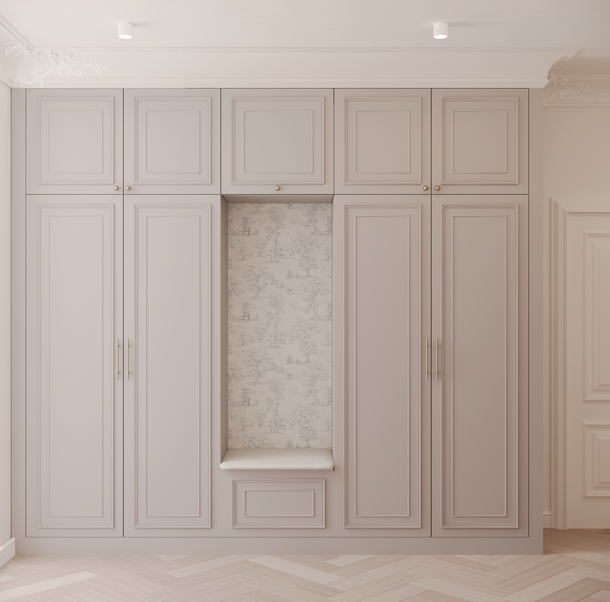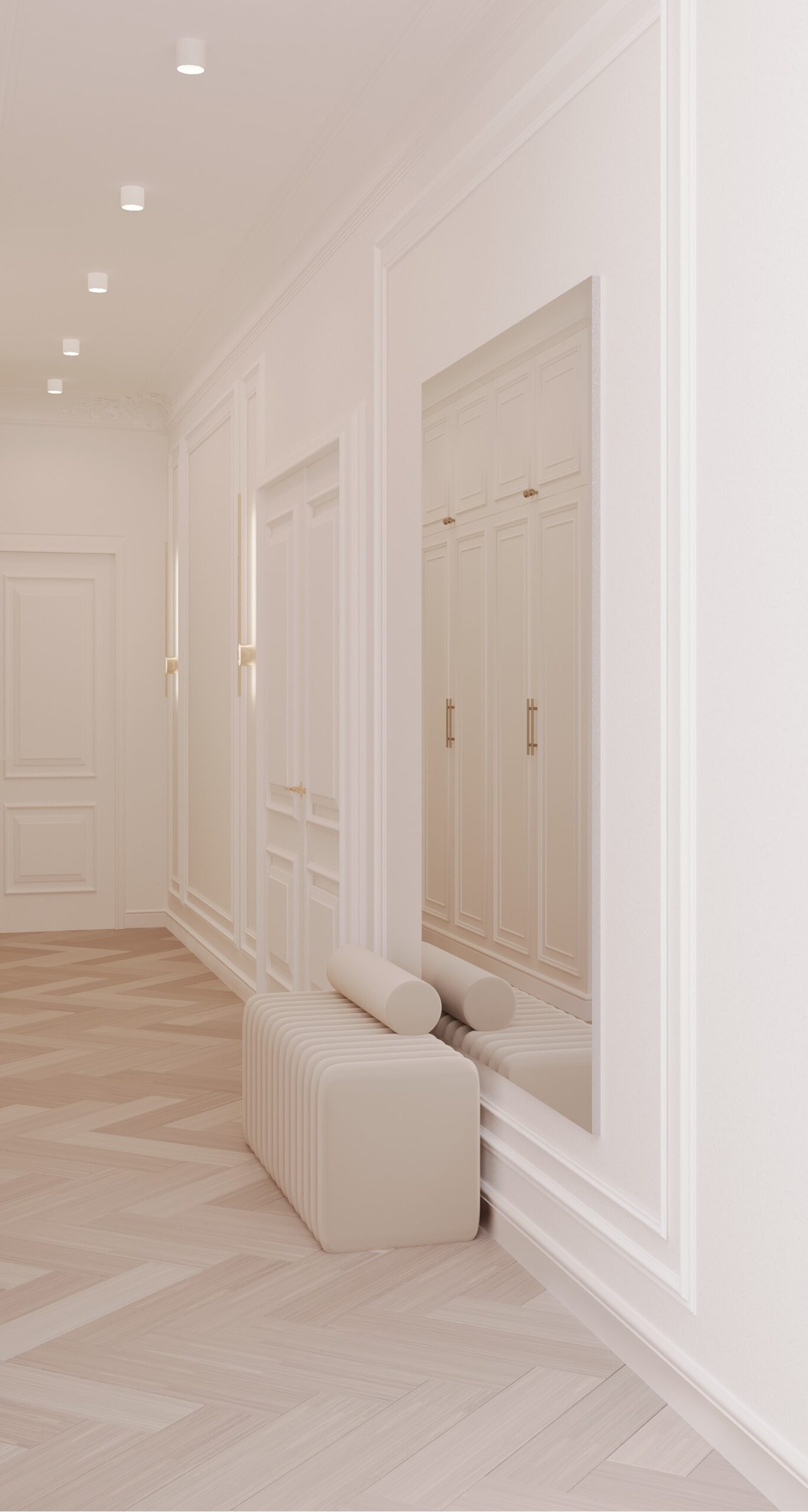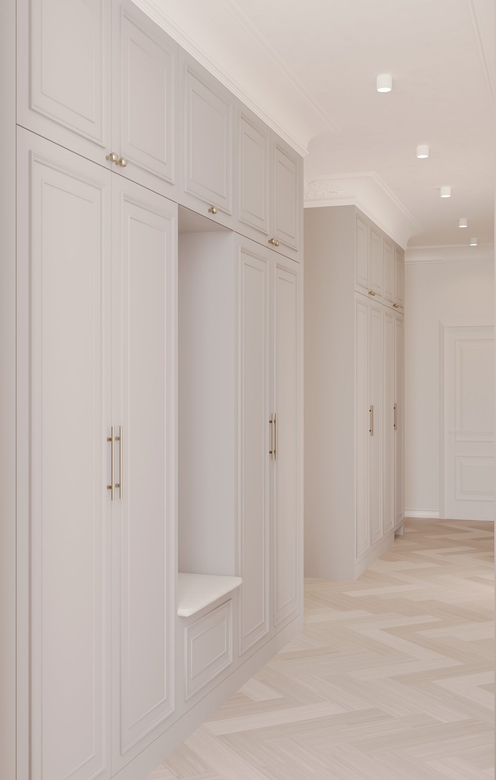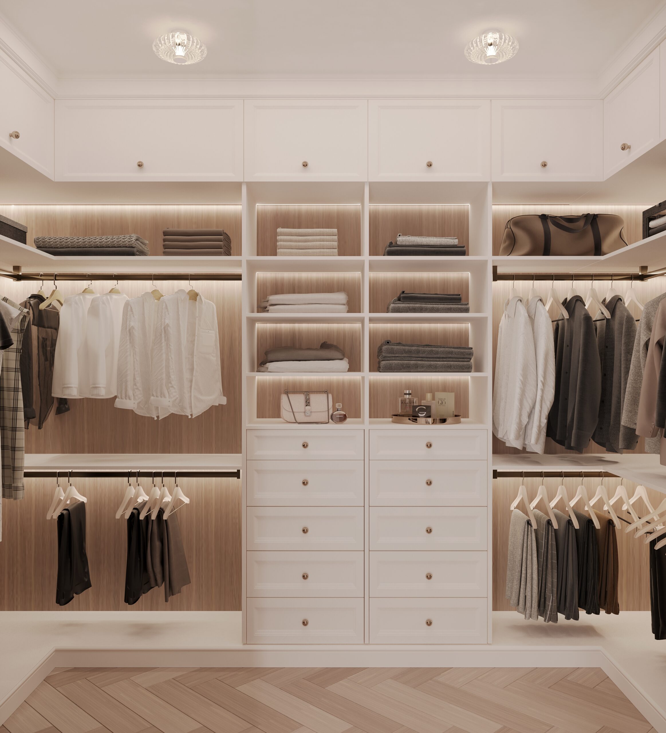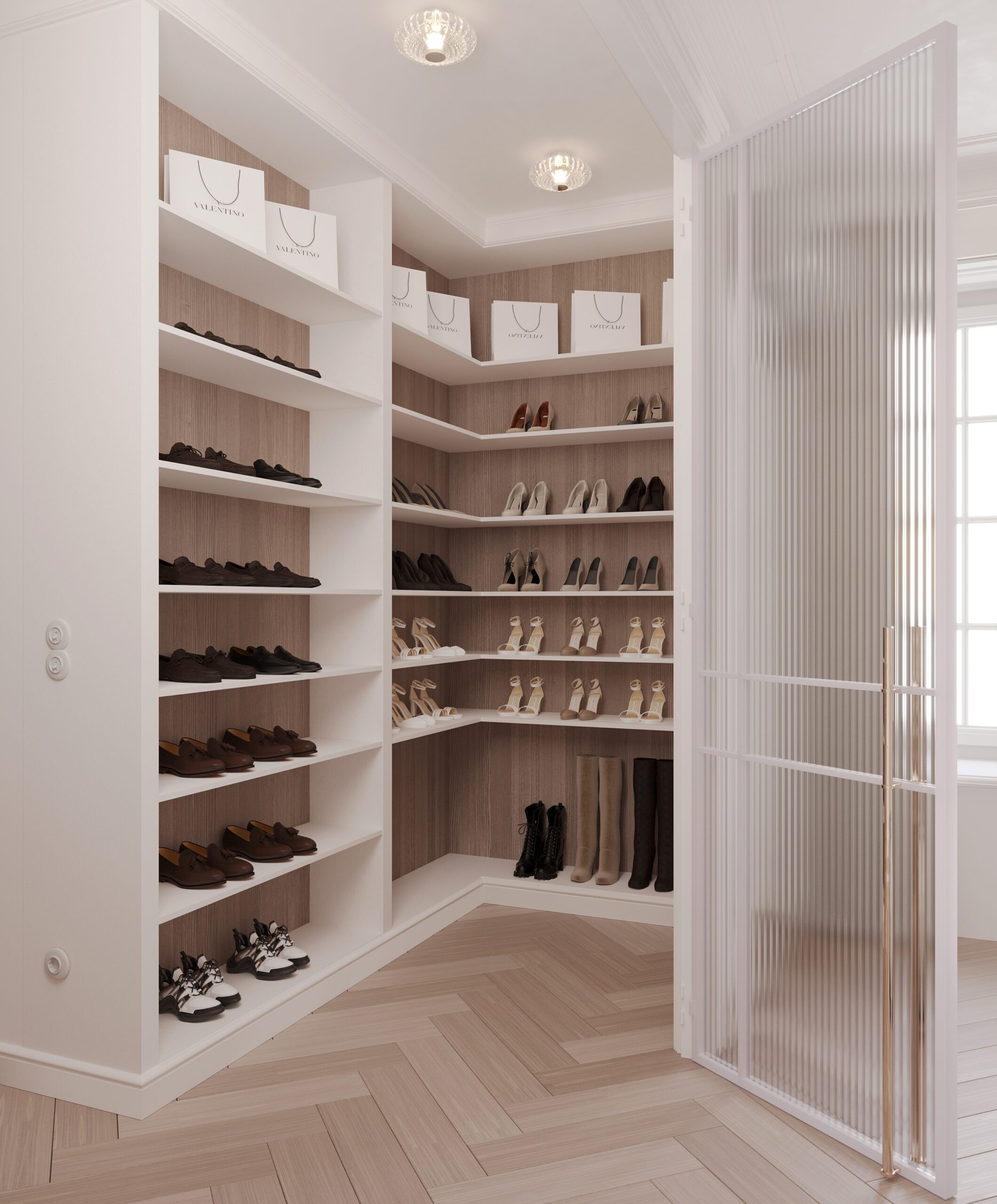 Po lewej stronie domu znajduje się master bedroom, który zaprojektowaliśmy z myślą o maksymalnym komforcie. Sypialnia posiada dwie garderoby: jedną na buty oraz drugą na ubrania, podzieloną na strefę damską i męską, zgodnie z potrzebami użytkowników.